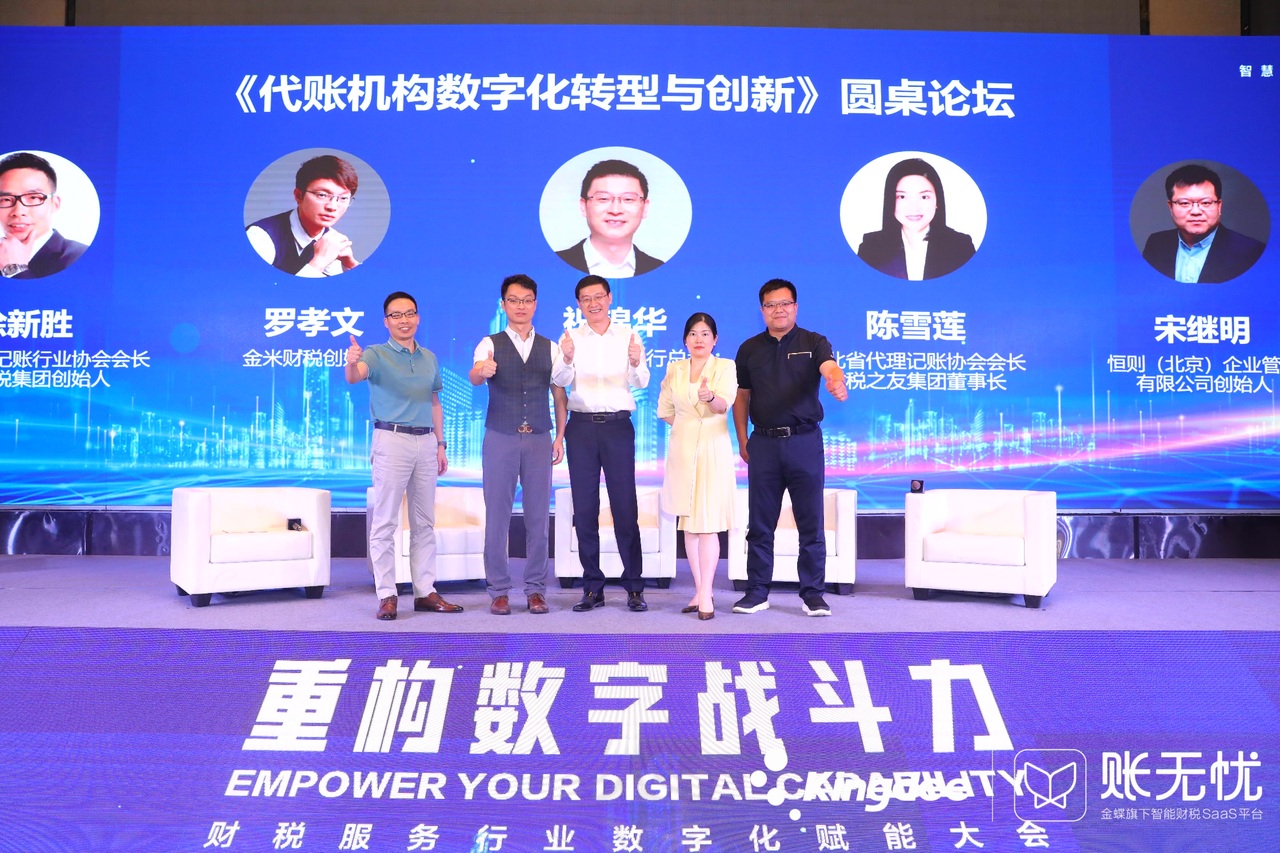 最后,武漢代理記賬行業(yè)協(xié)會會長徐新勝、湖北代理記賬協(xié)會會長陳雪蓮、金蝶賬無憂執(zhí)行總裁祝錦華、金米財(cái)稅創(chuàng)始人羅孝文、恒則(北京)企業(yè)管理有限公司創(chuàng)始人宋繼明展開了一場激烈的數(shù)字化轉(zhuǎn)型與創(chuàng)新的圓桌研討會,各方分享企業(yè)數(shù)字化轉(zhuǎn)型的心路歷程,并深入探討代賬機(jī)構(gòu)未來發(fā)展的趨勢,以及如何有效變革的優(yōu)秀實(shí)踐方法,為來賓們展現(xiàn)了一場豐富的思想盛宴。